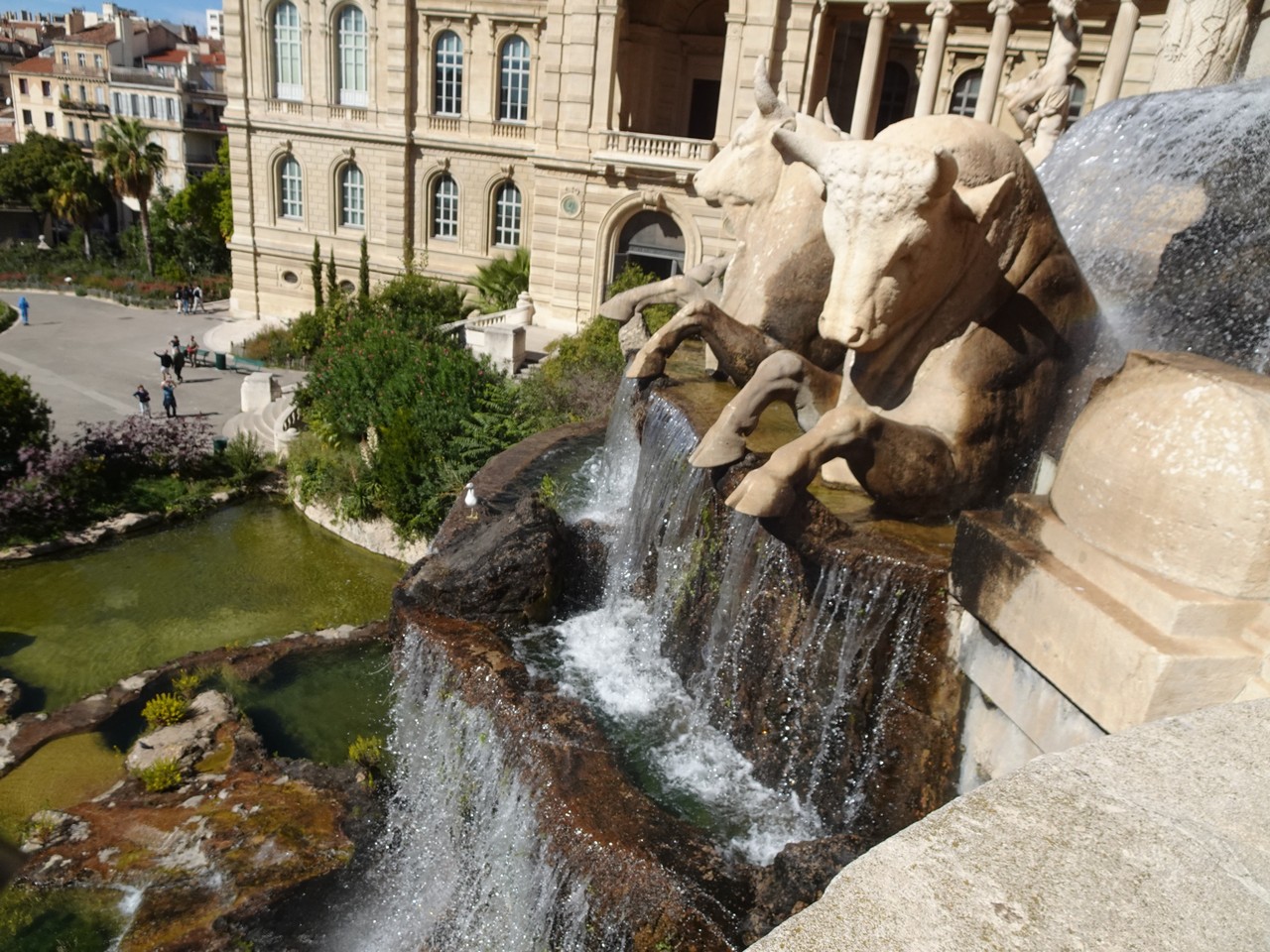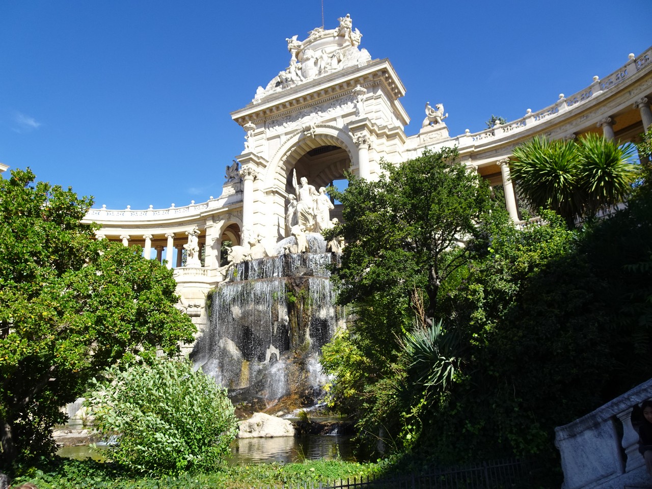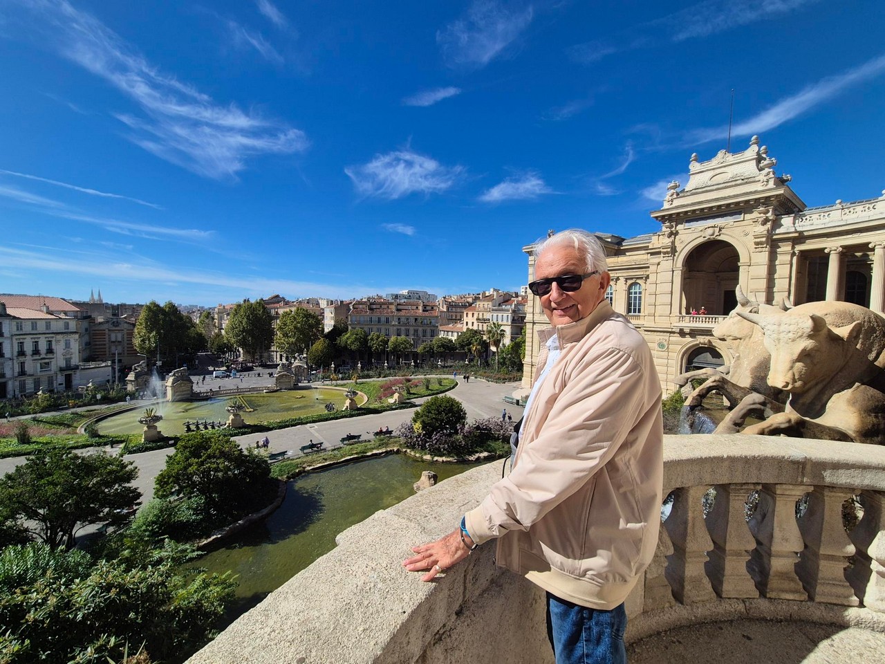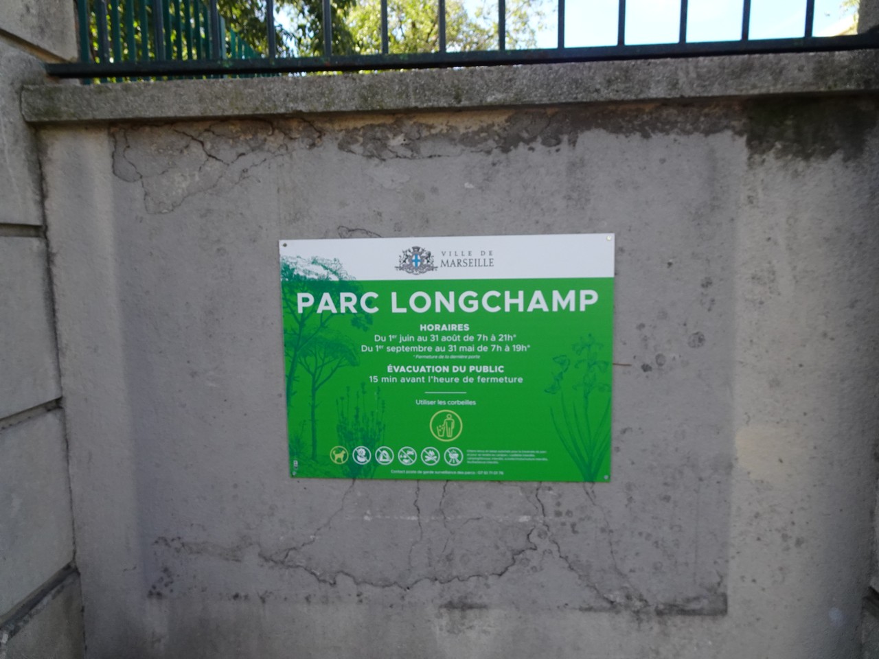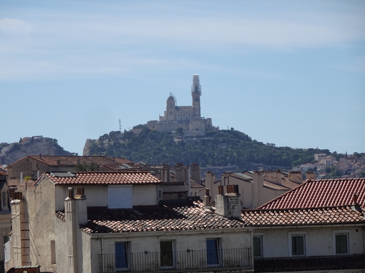 Spacer po parku Longchamps (Długie pola) na wzgórzu, pozwala zobaczyć odległe wzgórze z katedrą Notre Dame de Gard.
