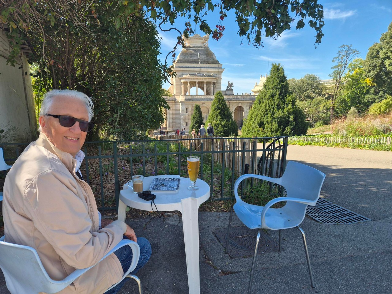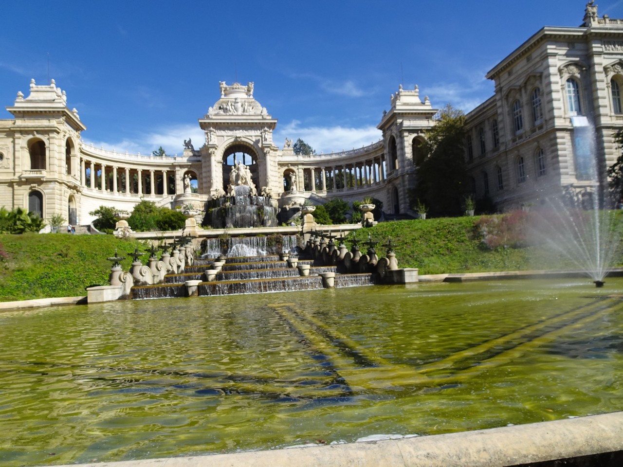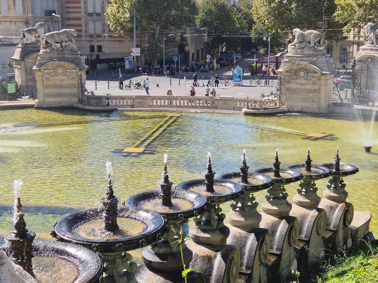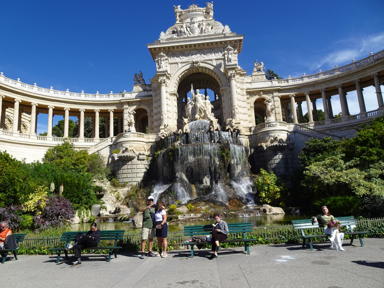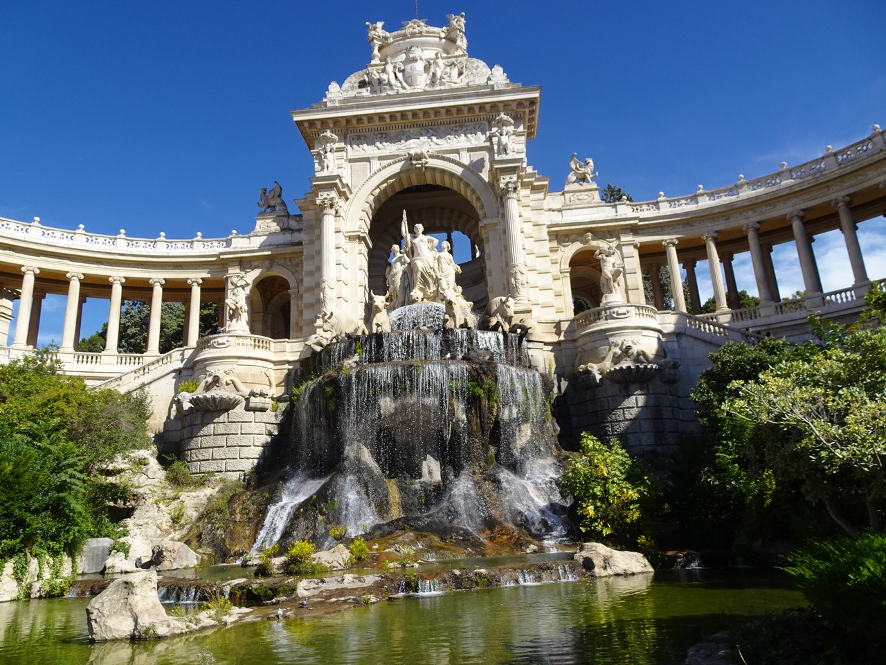 Spacer po parku Longchamps (Długie pola) na wzgórzu, pozwala zobaczyć odległe wzgórze z katedrą Notre Dame de Gard.