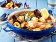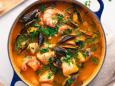 - In a pot of simmering stock over high heat, arrange the shrimp, fish, mussels, squid, and scallops in the following order: gently submerge them in the stock (they don't need to be completely covered). Cook for about 3 minutes, briefly, as the seafood cooks very quickly. Remove from the heat and sprinkle with fennel fronds. Serve with toasted baguette slices.