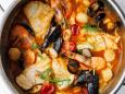 - Add chili flakes, bay leaf, star anise, and alcohol and cook for 1-2 minutes. Then add the peeled and diced tomato, halved cherry tomatoes, and the concentrate. Cook for about 3 minutes. Pour in the hot fish stock or water and bring to a boil. Season with salt, pepper, and sugar and cook uncovered over medium heat for about 15 minutes.
