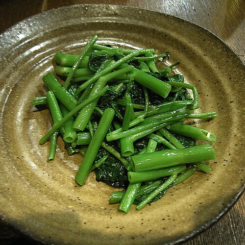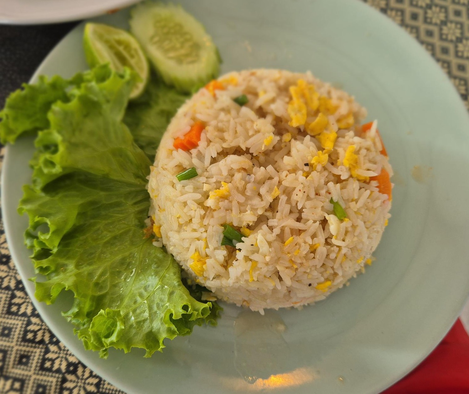 The most common dish is fried rice, available with various ingredients. The photo shows vegetables and a fried egg dish.