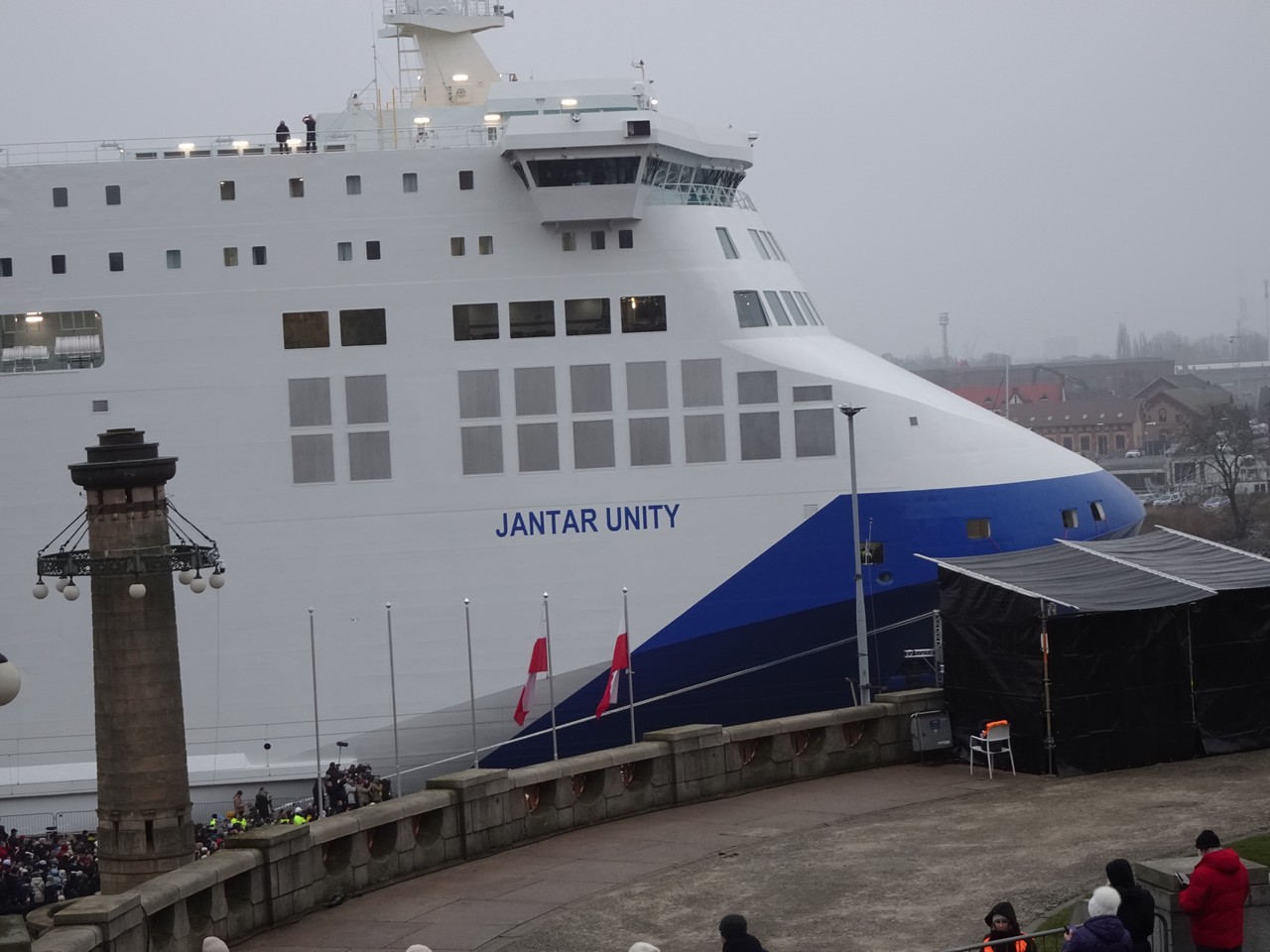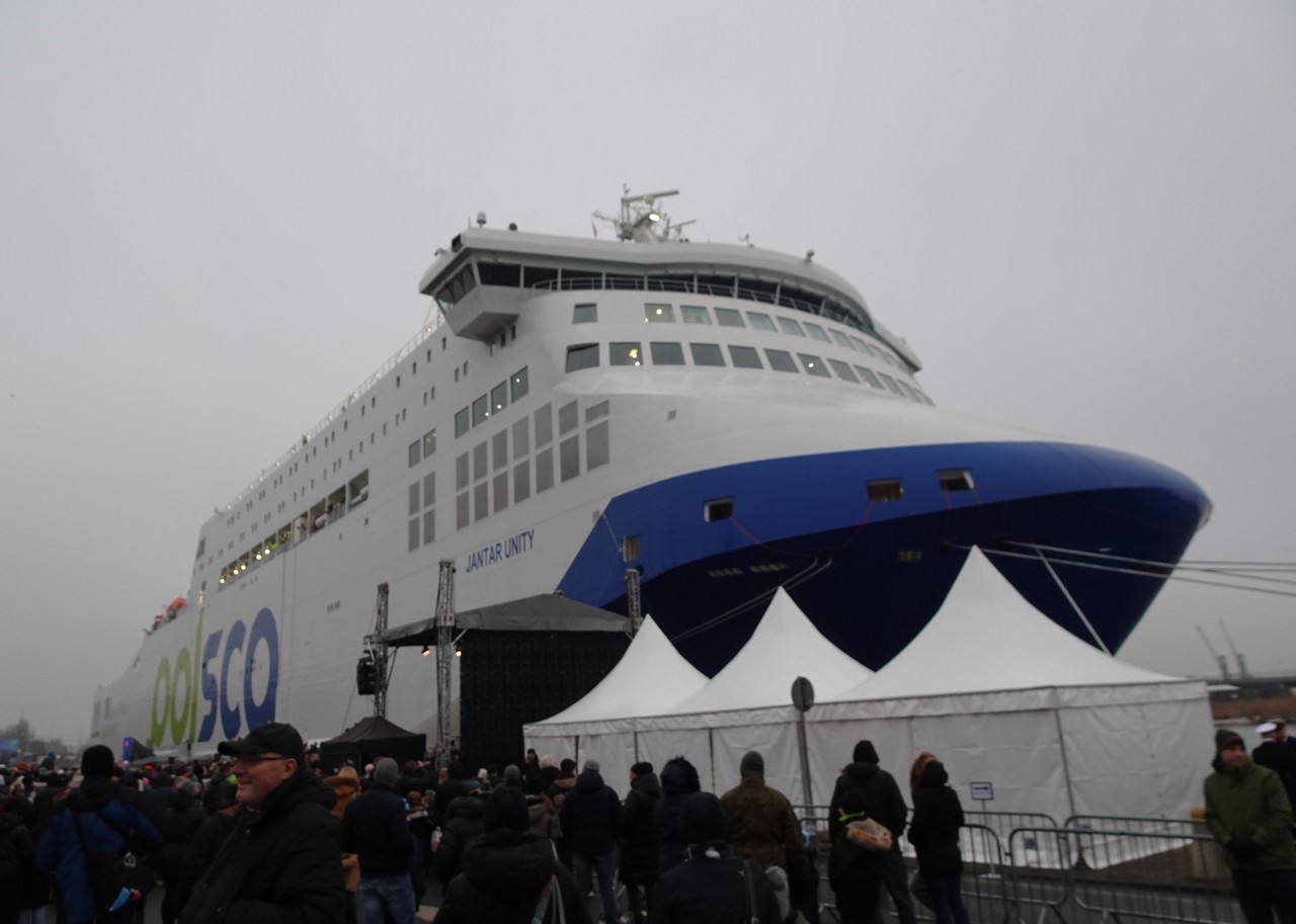 The christening ceremony for the Jantar Unity ferry began at 3:00 PM. The vessel has been moored at the Chrobry Embankment in Szczecin since Thursday.