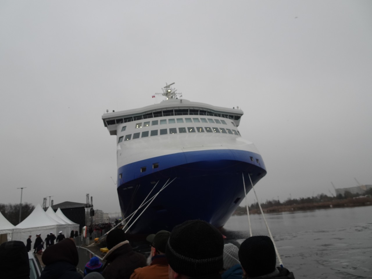 The ceremony lasted almost two hours, the officials gave appropriate speeches, and the godmother gave the ferry its name by smashing champagne against the side of the ship with a loud bang.
